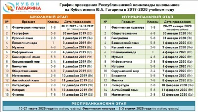 С 30.11.19 г. по 15.12.19 г. пройдет школьный этап Республиканской олимпиаде школьников на Кубок имени Ю.А. Гагарина для обучающихся 1-8 классов. Олимпиада является образовательно-патриотическим проектом, реализуемым на принципах общественно-государственного и общественно-муниципального партнерства. Олимпиада является неотъемлемой частью системы аэрокосмического и астрономического образования детей и молодежи, которая направлена на раннюю профориентацию обучающихся общеобразовательных организаций и их подготовку к поступлению в технические вузы страны. Учредитель Олимпиады – Автономная некоммерческая организация «Общественный комитет по развитию и поддержке образовательных проектов в Республике Башкортостан «Виктори».